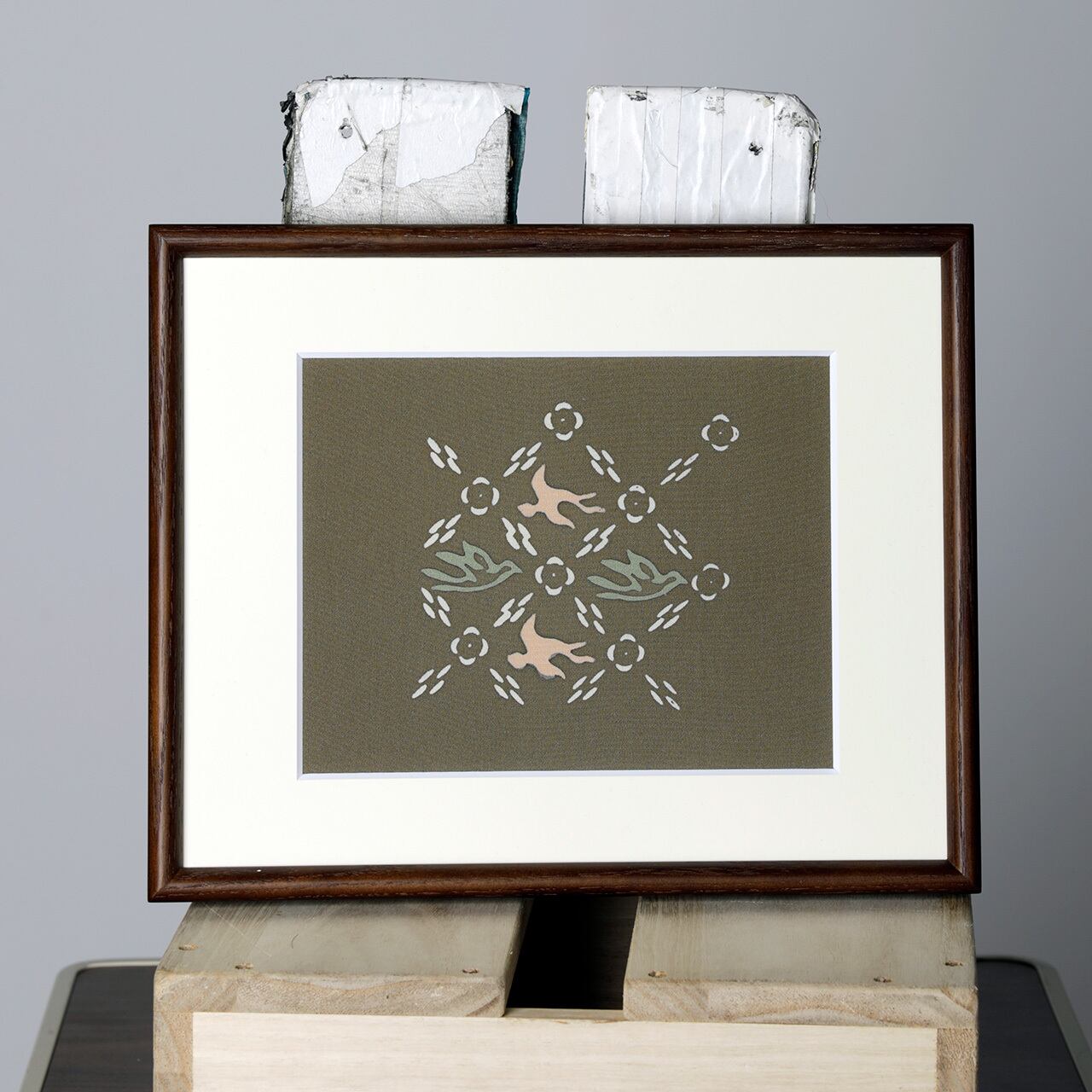 額サイズ 八切 24.2cm×30.3cm 布 銅版押しろうけつ染 松岡姫(絹100%) 逸品物 正倉院宝物「焦茶地霞襷花鳥文臈纈絁」の柄はそのままに、色を日常に馴染むように穏やかな色合いにアレンジしたものです